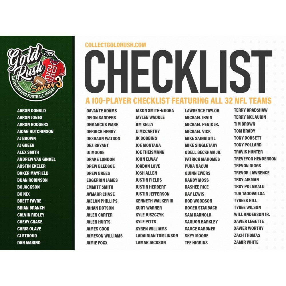 Die beeindruckende 100-Namen-Checkliste umfasst Spieler aller 32 NFL-Teams – mit Trikots aus der NFL und dem College-Football. Jedes Trikot wird von einem der führenden Anbieter professionell authentifiziert: Beckett, Fanatics, JSA oder PSA.